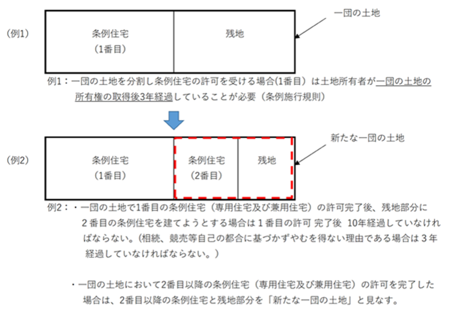 (3)条例住宅等の開発行為は、分譲目的でないことが必要となるため、開発行為を行おうとする一団の土地は所有権を有する方が所有権等の権原を取得してから3年以上経過※している土地であることが申請要件となります。