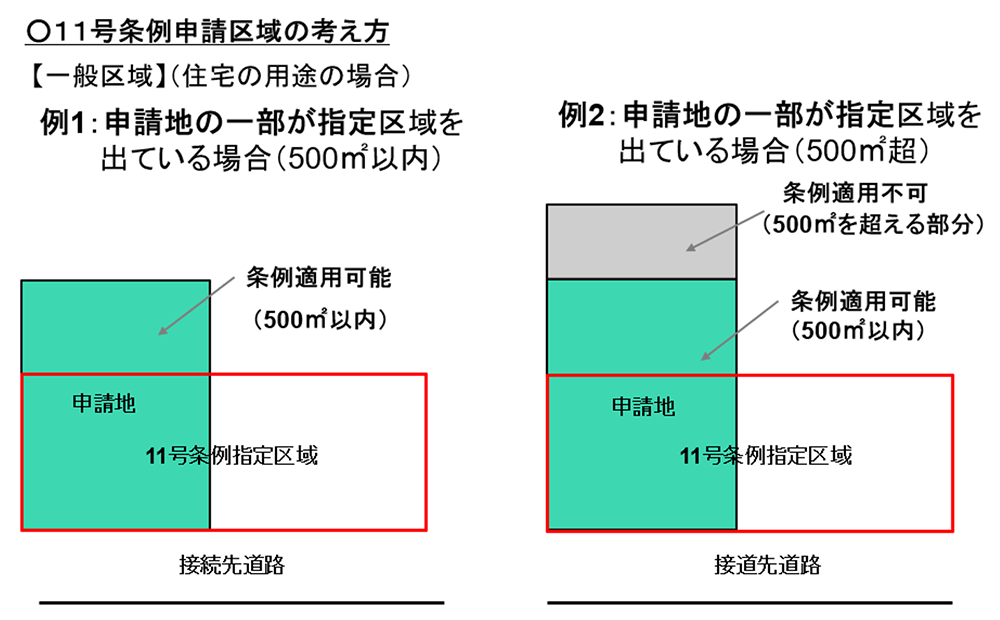 - 自己用住宅(市運用基準1号及び市運用基準2号)で開発許可を受ける土地の申請区域は指定区域(法第34条第11号適用区域)を含む敷地であることに加え、開発面積が165㎡以上500㎡以内であることが要件となります。判断例は図-1のとおりです。