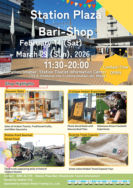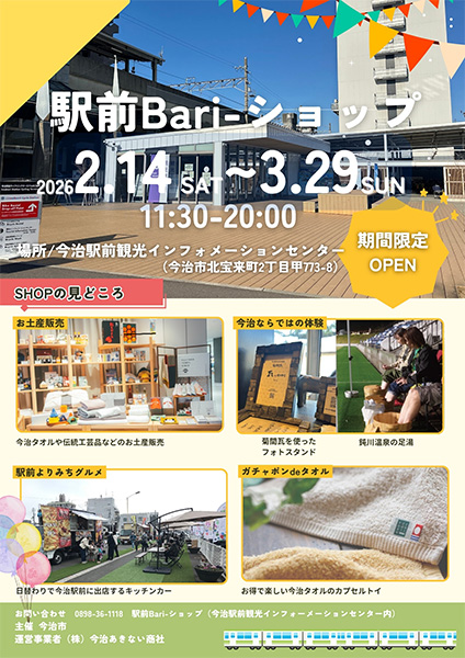 今治駅前エリアにおいて、今治ならではのお土産の販売や体験を提供する実証事業として、期間限定で「駅前Bariショップ」をオープンします!
