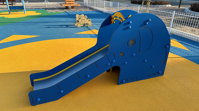 乳幼児エリアには、とてもかわいい動物たちの遊具が配置されています。このエリアには、ゴムチップという柔らかい舗装材を使用していて、小さいお子さんが転んだ場合の安全性に配慮しています。