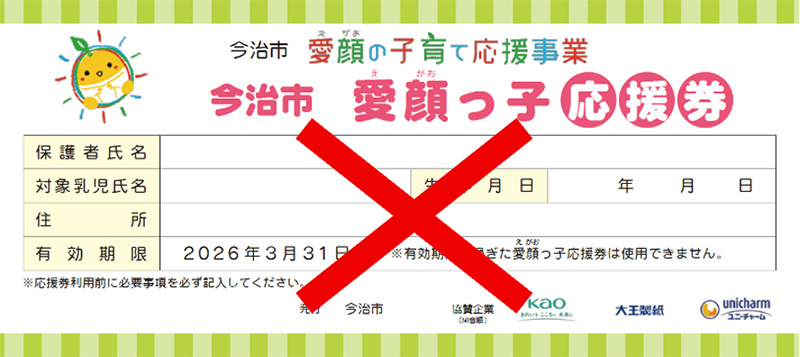 令和6年4⽉1⽇から令和7年3⽉31⽇までにお渡しした「今治市愛顔っ⼦応援券(みどり⾊)」の有効期限