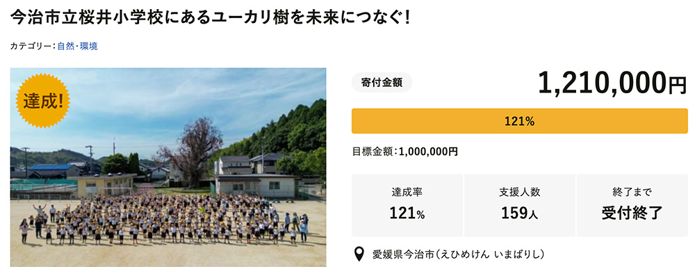 令和7年10月8日から令和8年1月5日に実施いたしました、今治市ガバメントクラウドファンディング事業「今治市立桜井小学校にあるユーカリ樹を未来につなぐ!」について、下記のとおり結果をお知らせいたします。