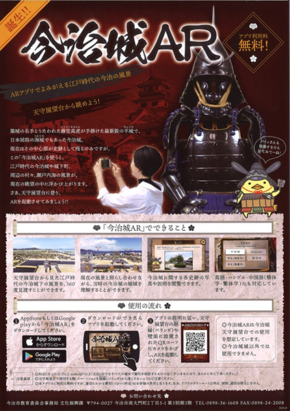 GooglePlay、App Storeにて、アプリ「今治城AR」をダウンロード。今治城天守展望台にてお楽しみください。