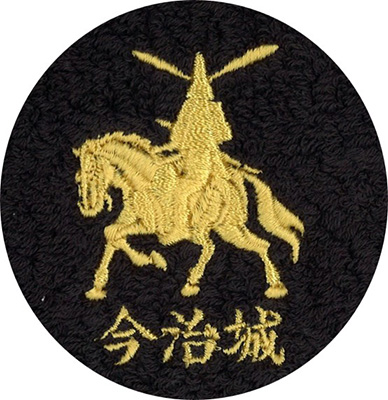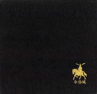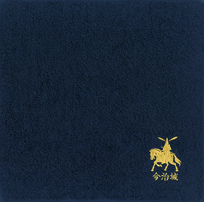 今治城を築城した藤堂高虎の騎馬シルエットをワンポイント(金色)で添えています。