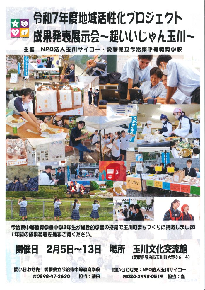 玉川文化交流館にて、NPO法人玉川サイコーと愛媛県立今治東中等教育学校が主催する地域活性化プロジェクトの成果発表展示会~超いいじゃん玉川~ が開催されます。