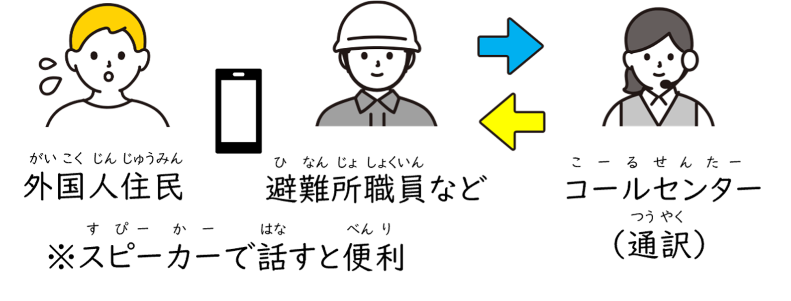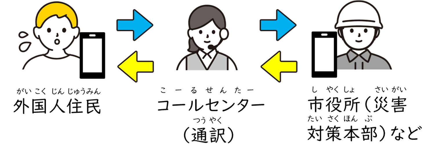 - 市役所や 災害対策本部などに つないで、通訳スタッフと 一緒に 話を します。